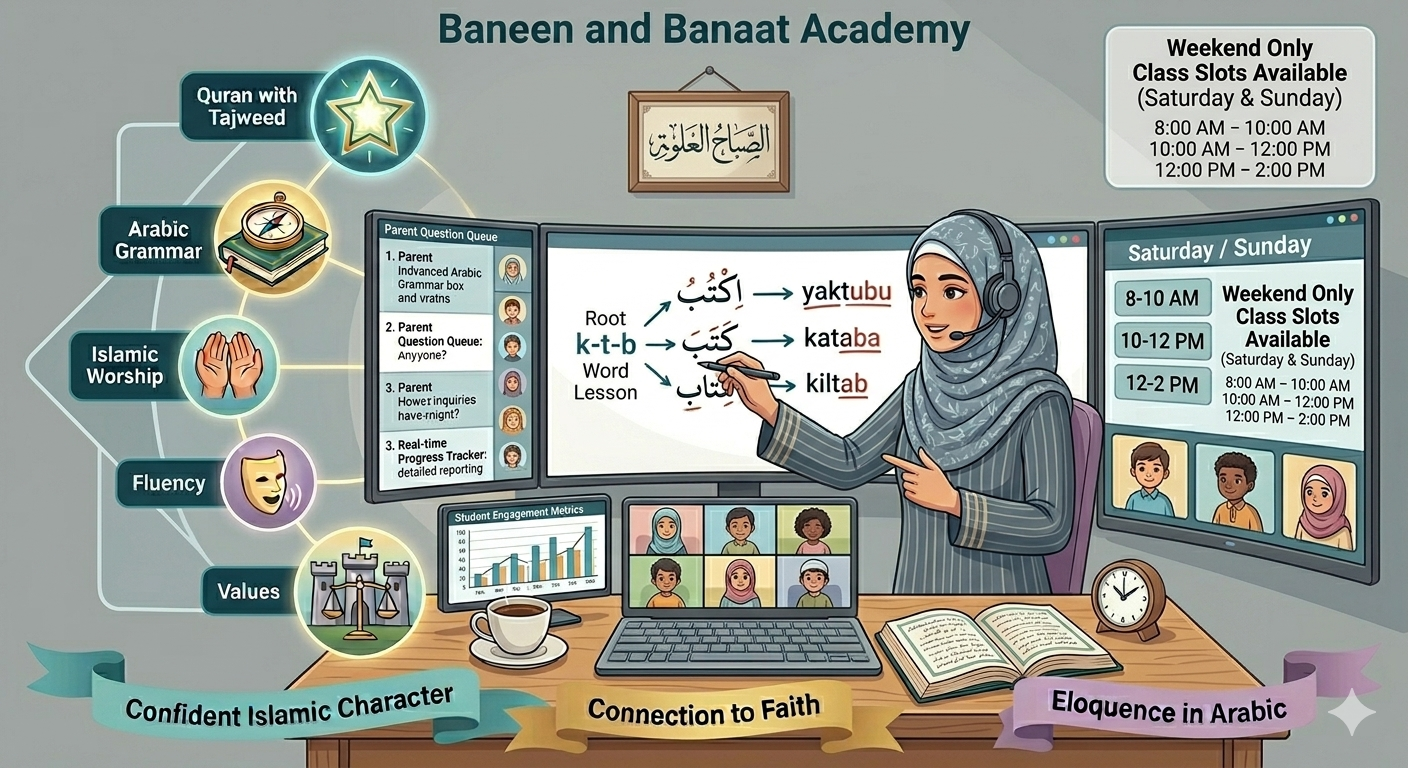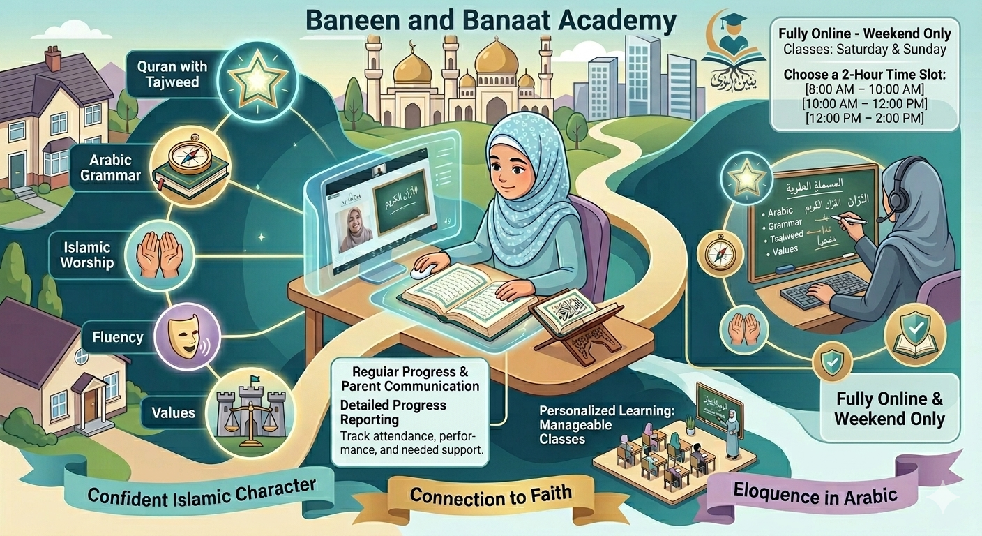 The Weekend Program is designed to help children abroad develop a confident Islamic identity while strengthening their Arabic and Quranic knowledge. Through engaging online lessons, students learn from the comfort of home while building strong language skills, faith, and character.